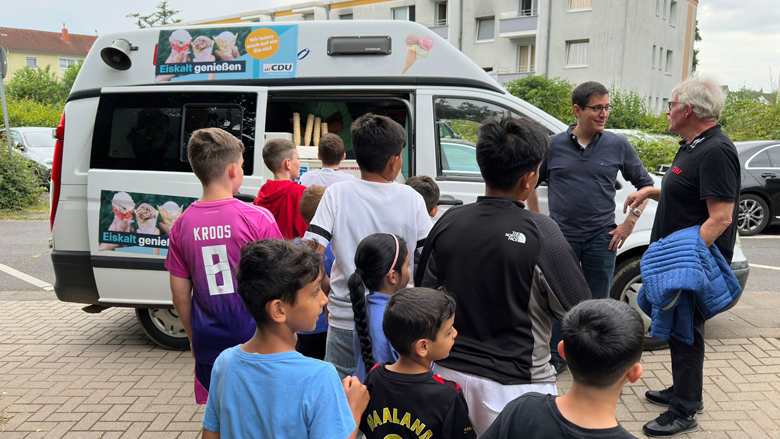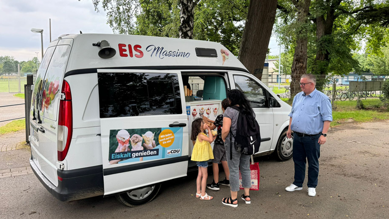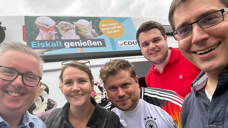 Am vergangenen Wochenende fand die diesjährige Eiswagentour der CDU Sankt Augustin statt. Gemeinsam mit dem Landtagsabgeordneten Sascha Lienesch und dem Bürgermeister der Stadt, Max Leitterstorf, fuhr der Eiswagen am Samstag und Sonntag diverse Spielplätze des Stadtgebiets an.