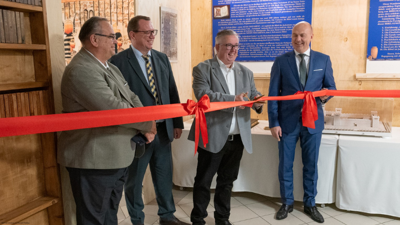 Sascha Lienesch war bei der Evangeliums-Christen-Baptistengemeinde in Sankt Augustin-Mülldorf zu Gast, wo er die Bibelausstellung 2025 offiziell eröffnete. Nach dem symbolischen Durchschneiden des roten Bandes erhielt er von Pfarrer Rudolf Fröse eine erste Führung durch die Ausstellung.
