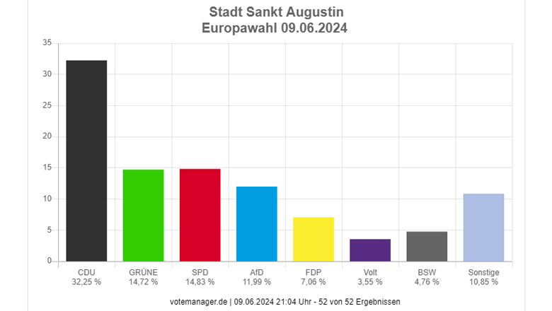 Im Rhein-Sieg-Kreis stieg die Wahlbeteiligung bei der Europawahl im Vergleich zum Jahr 2019 um 2,1 Prozentpunkte auf insgesamt 68,1 Prozent an. Die CDU holte hier 33,6 Prozent.